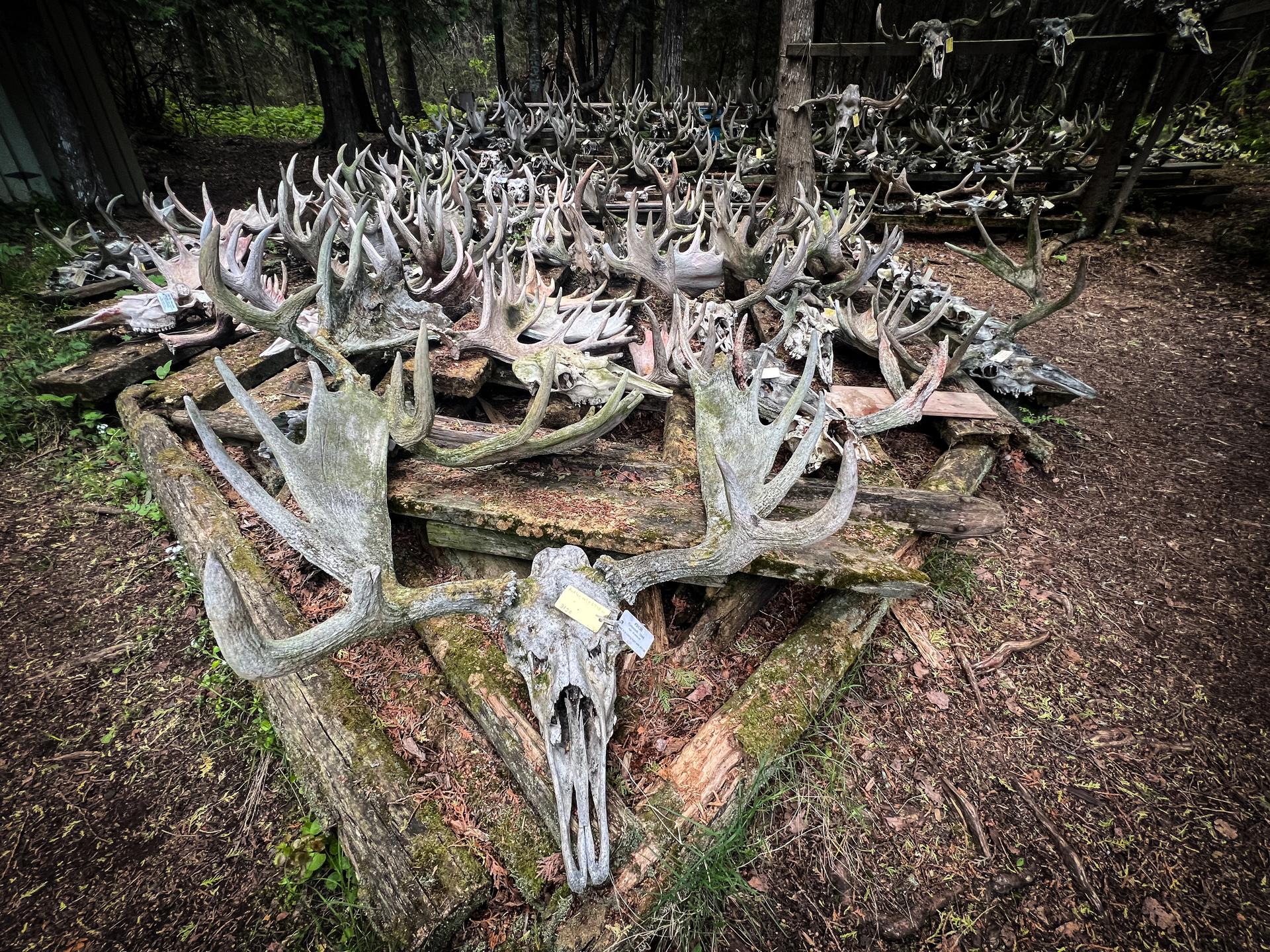 Bangsund Cabin remains an invaluable summer research base for the Wolf-Moose Project to this day. Each summer, field crews meet at the cabin so that the data they collect can be collated and samples can be carefully inventoried, processed, and labeled before being taken to labs on the mainland for further processing and analysis. Outside of the cabin is a display of the most unique and interesting antlered bull skulls that field crews have discovered over the years. |