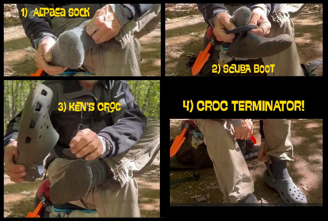 We've named the solution… The solution is called the Croc Terminator. It's the alpaca sock in a wet shoe, semi-scuba boot, in a Croc equals the Croc Terminator…