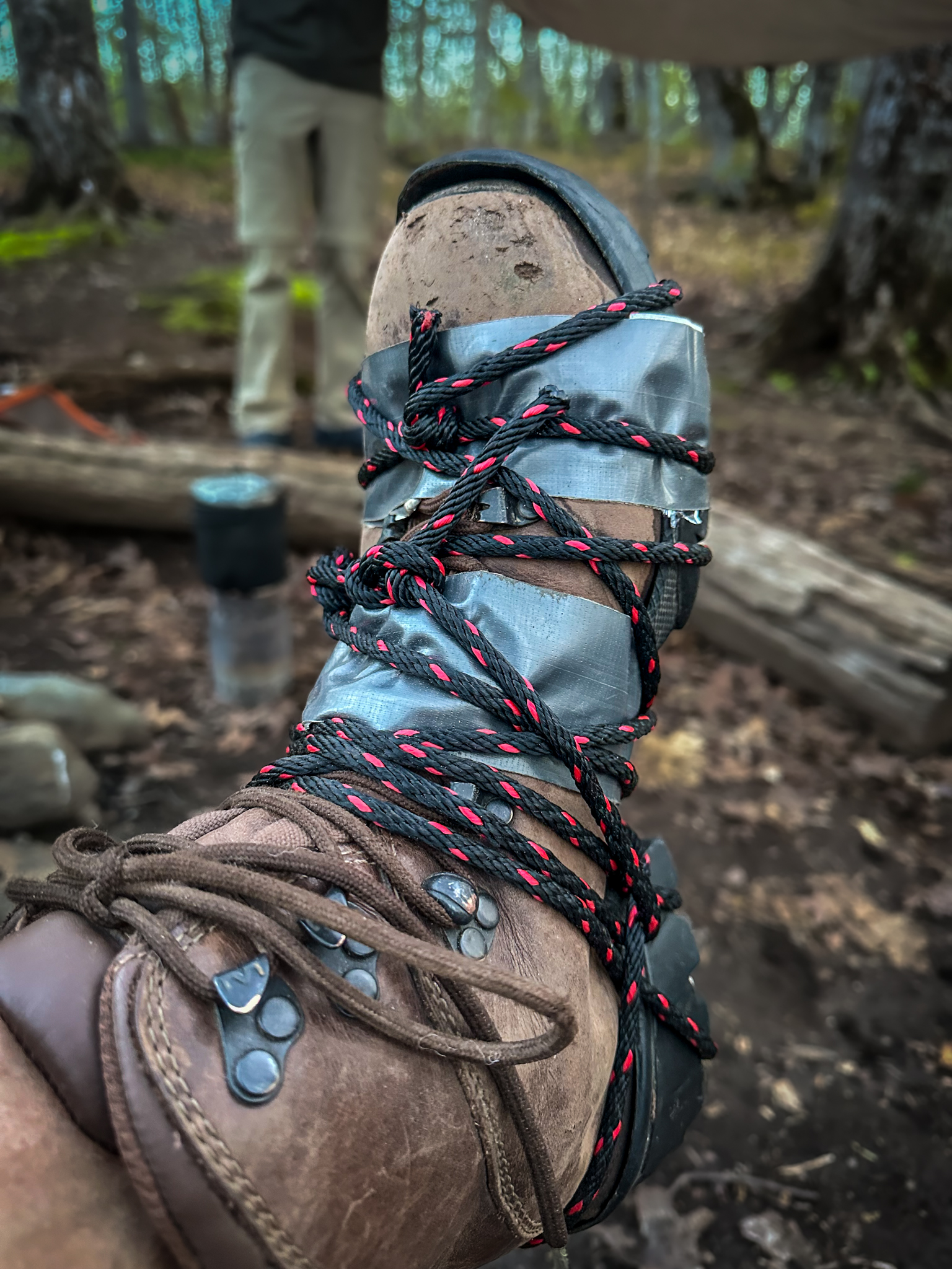 So my left shoe was the one that was a problem. We tied it up real good that day. We went hiking without packs. And probably halfway out, the bottom came off again. So I went back and decided this isn't gonna work. So I did tie it up one more time for another half-day hike. And it came off again. And my right one separated.